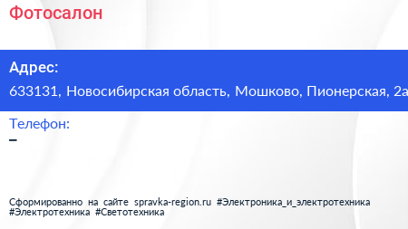 Фотосалон по адресу 633131, Новосибирская область, Мошково, Пионерская, 2а в дальнейшем Организация, размещена в следующих категориях: