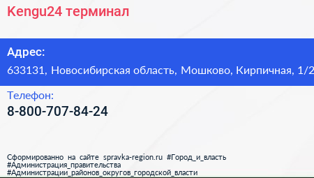 Kengu24, терминал по адресу 633131, Новосибирская область, Мошково, Кирпичная, 1/2 в дальнейшем Организация, размещена в следующих категориях:
