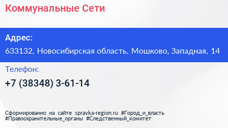 Коммунальные Сети по адресу 633132, Новосибирская область, Мошково, Западная, 14 в дальнейшем Организация, размещена в следующих категориях: