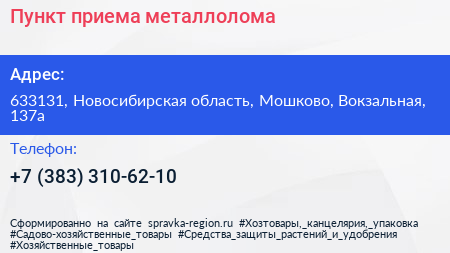 Пункт приема металлолома по адресу 633131, Новосибирская область, Мошково, Вокзальная, 137а в дальнейшем Организация, размещена в следующих категориях: