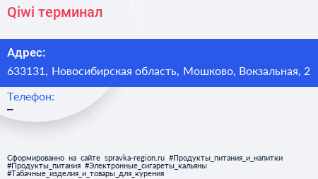 Qiwi, терминал по адресу 633131, Новосибирская область, Мошково, Вокзальная, 2 в дальнейшем Организация, размещена в следующих категориях: