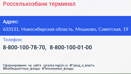 Россельхозбанк, терминал по адресу 633131, Новосибирская область, Мошково, Советская, 19 в дальнейшем Организация, размещена в следующих категориях: