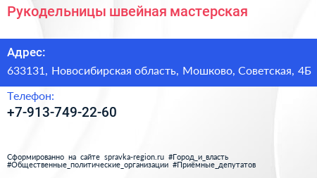 Рукодельницы, швейная мастерская по адресу 633131, Новосибирская область, Мошково, Советская, 4Б в дальнейшем Организация, размещена в следующих категориях: