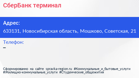 СберБанк, терминал по адресу 633131, Новосибирская область, Мошково, Советская, 21 в дальнейшем Организация, размещена в следующих категориях: