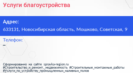 Услуги благоустройства по адресу 633131, Новосибирская область, Мошково, Советская, 9 в дальнейшем Организация, размещена в следующих категориях: