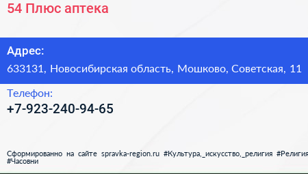54 Плюс, аптека по адресу 633131, Новосибирская область, Мошково, Советская, 11 в дальнейшем Организация, размещена в следующих категориях: