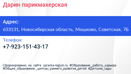 Дарин, парикмахерская по адресу 633131, Новосибирская область, Мошково, Советская, 7Б в дальнейшем Организация, размещена в следующих категориях: