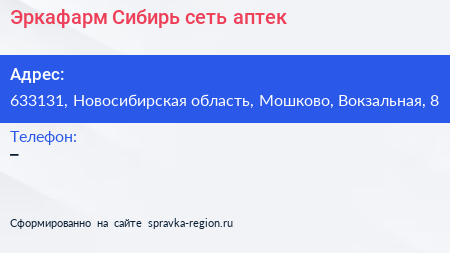 Эркафарм Сибирь, сеть аптек по адресу 633131, Новосибирская область, Мошково, Вокзальная, 8 в дальнейшем Организация, размещена в следующих категориях: