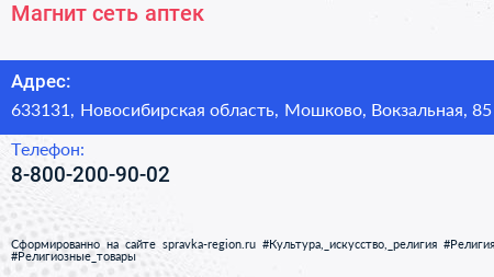 Магнит, сеть аптек по адресу 633131, Новосибирская область, Мошково, Вокзальная, 85 в дальнейшем Организация, размещена в следующих категориях: