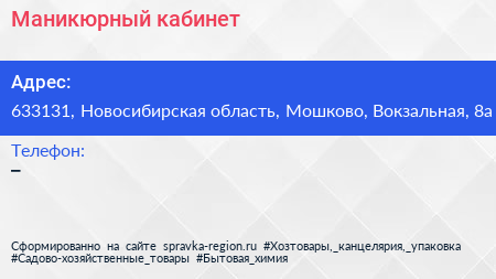 Маникюрный кабинет по адресу 633131, Новосибирская область, Мошково, Вокзальная, 8а в дальнейшем Организация, размещена в следующих категориях: