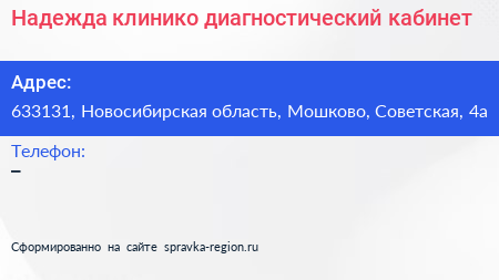 Надежда, клинико-диагностический кабинет по адресу 633131, Новосибирская область, Мошково, Советская, 4а в дальнейшем Организация, размещена в следующих категориях: