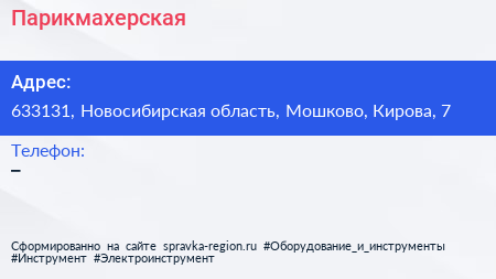 Парикмахерская по адресу 633131, Новосибирская область, Мошково, Кирова, 7 в дальнейшем Организация, размещена в следующих категориях:
