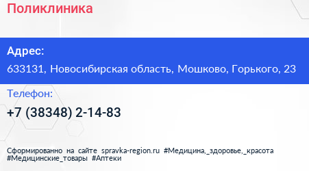Поликлиника по адресу 633131, Новосибирская область, Мошково, Горького, 23 в дальнейшем Организация, размещена в следующих категориях: