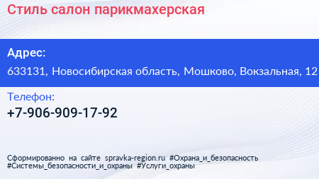 Стиль, салон-парикмахерская по адресу 633131, Новосибирская область, Мошково, Вокзальная, 12 в дальнейшем Организация, размещена в следующих категориях: