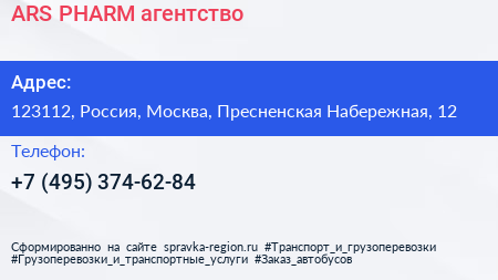 ARS PHARM, агентство по адресу 123112, Россия, Москва, Пресненская Набережная, 12 в дальнейшем Организация, размещена в следующих категориях: