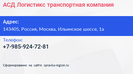 АСД Логистикс, транспортная компания по адресу 143405, Россия, Москва, Ильинское шоссе, 1а в дальнейшем Организация, размещена в следующих категориях: