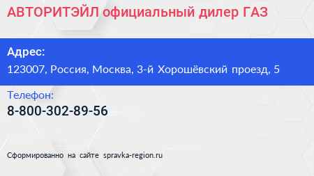 АВТОРИТЭЙЛ, официальный дилер ГАЗ по адресу 123007, Россия, Москва, 3-й Хорошёвский проезд, 5 в дальнейшем Организация, размещена в следующих категориях: