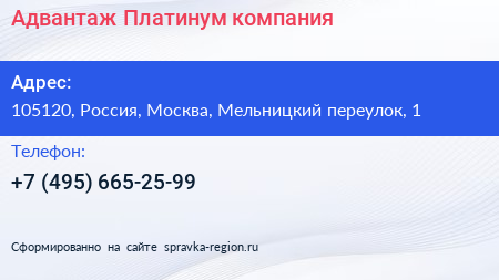 Адвантаж Платинум, компания по адресу 105120, Россия, Москва, Мельницкий переулок, 1 в дальнейшем Организация, размещена в следующих категориях: