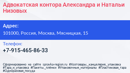 Адвокатская контора Александра и Натальи Низовых по адресу 101000, Россия, Москва, Мясницкая, 15 в дальнейшем Организация, размещена в следующих категориях: