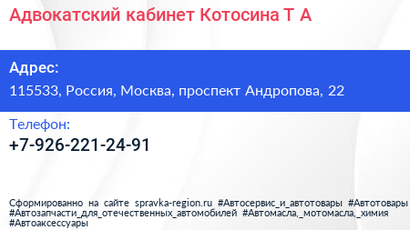 Адвокатский кабинет Котосина Т.А. по адресу 115533, Россия, Москва, проспект Андропова, 22 в дальнейшем Организация, размещена в следующих категориях: