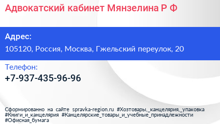 Адвокатский кабинет Мянзелина Р.Ф. по адресу 105120, Россия, Москва, Гжельский переулок, 20 в дальнейшем Организация, размещена в следующих категориях: