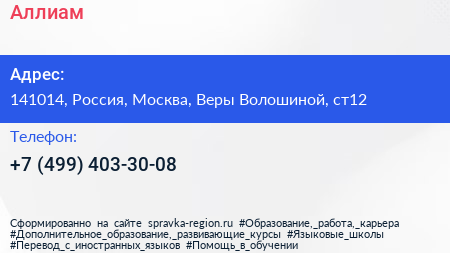 Аллиам по адресу 141014, Россия, Москва, Веры Волошиной, ст12 в дальнейшем Организация, размещена в следующих категориях: