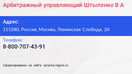 Арбитражный управляющий Штыленко В.А. по адресу 115280, Россия, Москва, Ленинская Слобода, 26 в дальнейшем Организация, размещена в следующих категориях: