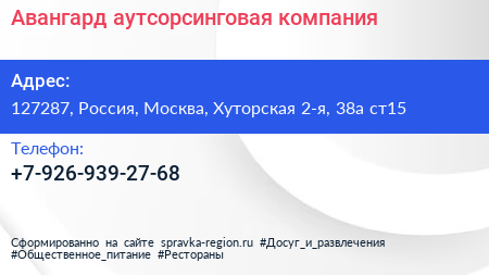 Авангард, аутсорсинговая компания по адресу 127287, Россия, Москва, Хуторская 2-я, 38а ст15 в дальнейшем Организация, размещена в следующих категориях: