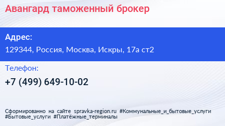 Авангард, таможенный брокер по адресу 129344, Россия, Москва, Искры, 17а ст2 в дальнейшем Организация, размещена в следующих категориях: