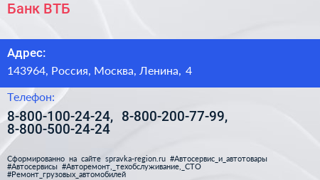Банк ВТБ по адресу 143964, Россия, Москва, Ленина, 4 в дальнейшем Организация, размещена в следующих категориях: