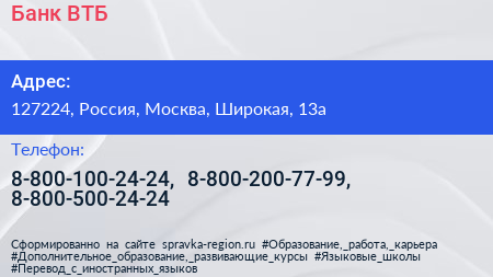 Банк ВТБ по адресу 127224, Россия, Москва, Широкая, 13а в дальнейшем Организация, размещена в следующих категориях: