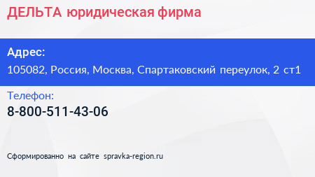 ДЕЛЬТА, юридическая фирма по адресу 105082, Россия, Москва, Спартаковский переулок, 2 ст1 в дальнейшем Организация, размещена в следующих категориях: