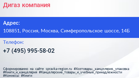 Для связи с организацией воспользуйтесь номером телефона: +7 (495) 995-58-02. Пн: c 09:00-18:00, Вт: c 09:00-18:00, Ср: c 09:00-18:00, Чт: c 09:00-18:00, Пт: c 09:00-18:00, Сб: выходной, Вс: выходной, вы можете обратиться в эту организацию.