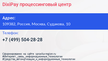 DixiPay, процессинговый центр по адресу 109382, Россия, Москва, Судакова, 10 в дальнейшем Организация, размещена в следующих категориях: