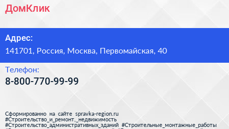ДомКлик по адресу 141701, Россия, Москва, Первомайская, 40 в дальнейшем Организация, размещена в следующих категориях: