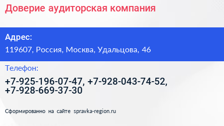 Доверие, аудиторская компания по адресу 119607, Россия, Москва, Удальцова, 46 в дальнейшем Организация, размещена в следующих категориях: