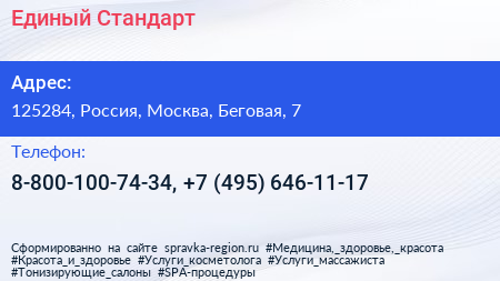 Единый Стандарт по адресу 125284, Россия, Москва, Беговая, 7 в дальнейшем Организация, размещена в следующих категориях: