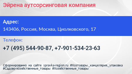 Эйрена, аутсорсинговая компания по адресу 143406, Россия, Москва, Циолковского, 17 в дальнейшем Организация, размещена в следующих категориях: