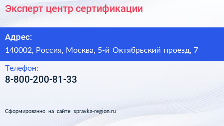 Эксперт, центр сертификации по адресу 140002, Россия, Москва, 5-й Октябрьский проезд, 7 в дальнейшем Организация, размещена в следующих категориях: