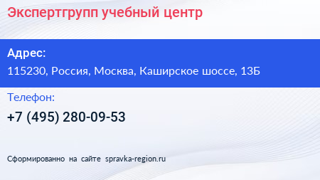 Экспертгрупп, учебный центр по адресу 115230, Россия, Москва, Каширское шоссе, 13Б в дальнейшем Организация, размещена в следующих категориях: