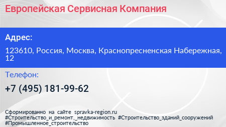 Европейская Сервисная Компания по адресу 123610, Россия, Москва, Краснопресненская Набережная, 12 в дальнейшем Организация, размещена в следующих категориях: