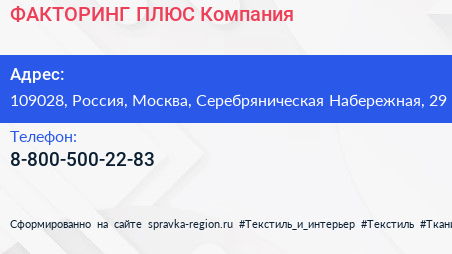 ФАКТОРИНГ ПЛЮС, Компания по адресу 109028, Россия, Москва, Серебряническая Набережная, 29 в дальнейшем Организация, размещена в следующих категориях: