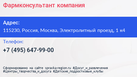 Фармконсультант, компания по адресу 115230, Россия, Москва, Электролитный проезд, 1 к4 в дальнейшем Организация, размещена в следующих категориях: