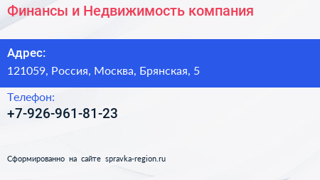 Финансы и Недвижимость, компания по адресу 121059, Россия, Москва, Брянская, 5 в дальнейшем Организация, размещена в следующих категориях: