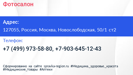 Фотосалон по адресу 127055, Россия, Москва, Новослободская, 50/1 ст2 в дальнейшем Организация, размещена в следующих категориях: