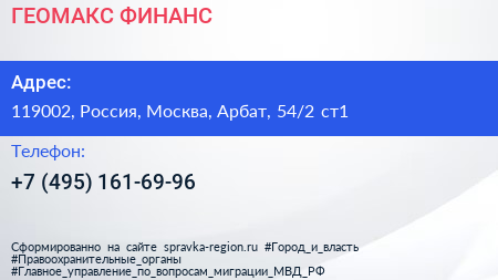 ГЕОМАКС ФИНАНС по адресу 119002, Россия, Москва, Арбат, 54/2 ст1 в дальнейшем Организация, размещена в следующих категориях: