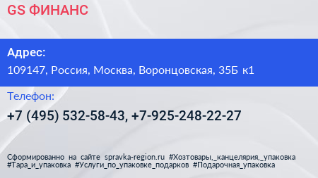 GS ФИНАНС по адресу 109147, Россия, Москва, Воронцовская, 35Б к1 в дальнейшем Организация, размещена в следующих категориях: