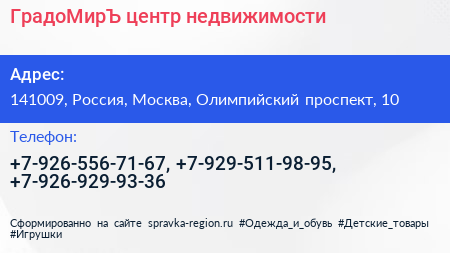 ГрадоМирЪ, центр недвижимости по адресу 141009, Россия, Москва, Олимпийский проспект, 10 в дальнейшем Организация, размещена в следующих категориях: