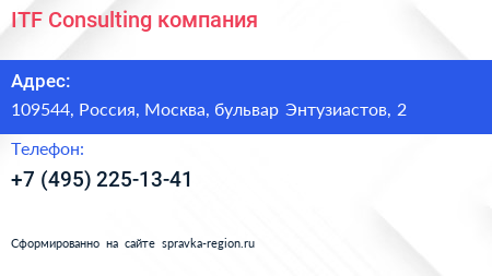 ITF Consulting, компания по адресу 109544, Россия, Москва, бульвар Энтузиастов, 2 в дальнейшем Организация, размещена в следующих категориях: