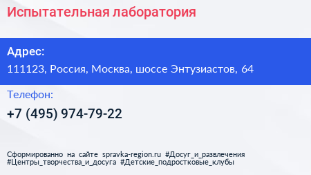Испытательная лаборатория по адресу 111123, Россия, Москва, шоссе Энтузиастов, 64 в дальнейшем Организация, размещена в следующих категориях: